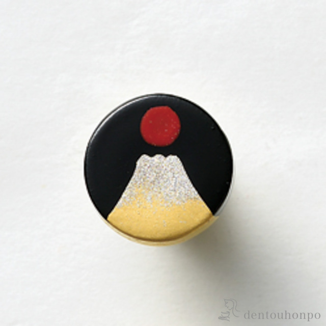 9 9越前漆器 うるしピンズ 丸型 富士山 黒 4,720円(税別) 1500年の歴史を有する越前塗。小さいブローチながらに、職人の技が光る、手書き蒔絵の手法で絵付けが施されています。