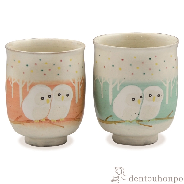 13 13清水焼 京焼 組湯呑 白ふくろう ペア 9,100円(税別) パステル調の森の景色を背景に、仲睦まじく寄り添うふくろうがエレガントに描かれた湯呑です。