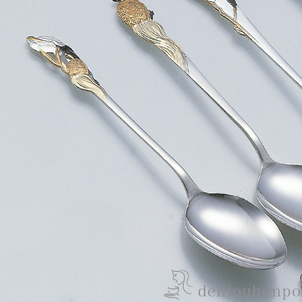21 21東京銀器(銀工芸) 銀製 コーヒースプーン 鶴亀 13,500円(税別) 繊細で可愛い銀製コーヒースプーン。持ち手には金色があしらわれているので華やかさがあり、小さいけれど日々の暮らしに贅沢を感じさせてくれます。銀製のカトラリーは代々受け継ぐご自宅用としてはもちろん、人生の大事なイベントの記念品やプレゼントとしても相応しい一品です。